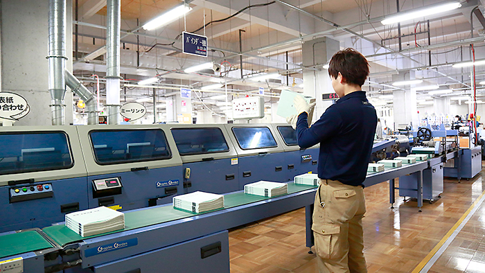 製本部では、無線綴じ、中綴じのほかに表面加工、立体倉庫を使った製品の保管と発送業務などを行っています。また、製作工程で出る資材ごみを27品目に分別しリサイクルするなど、CSR活動にも積極的に取り組んでいます。