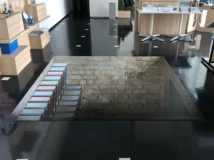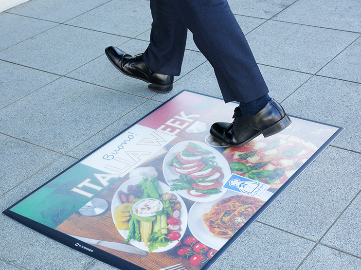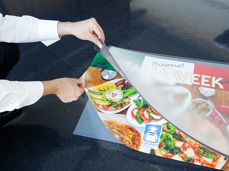 塩ビ製のシートに、歩行しやすいフロアラミネートで加工した床シートです。インクジェットで自由なデザインを印刷できるので、イベントエリアのフロアデザインから、フォトスポットまで活用できるアイテムです。来場者の目を引く、トリックアートの仕掛けも手軽にできてオススメです。