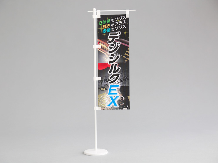 店舗のカウンターなど卓上に設置できるミニサイズののぼりです。竿や立て台もセットになった商品です。
