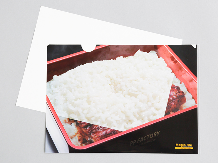 紙を入れると絵柄が変わる!定番のクリアファイルも絵柄に工夫をすると目立つ販促ツールに早変わりします。