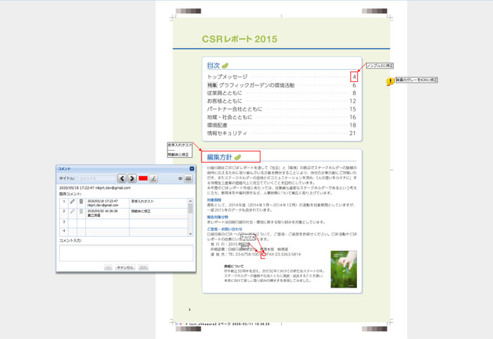 コメント・図形描画機能などを利用して、複数の校正担当者が同時に指示を入れることができます。