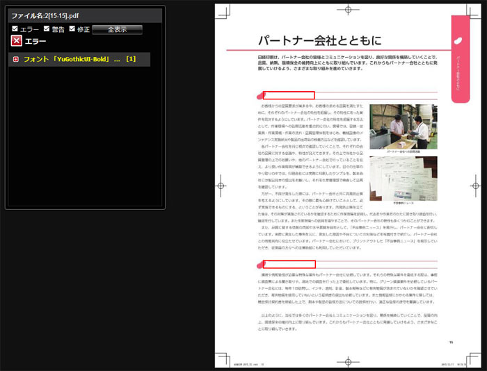 「EQUIOS Online」では、アップロードするPDFに対して、プリフライトチェックをかけることができます。問題のある個所も明示されますので、データ不備の発見がしやすくなります。
