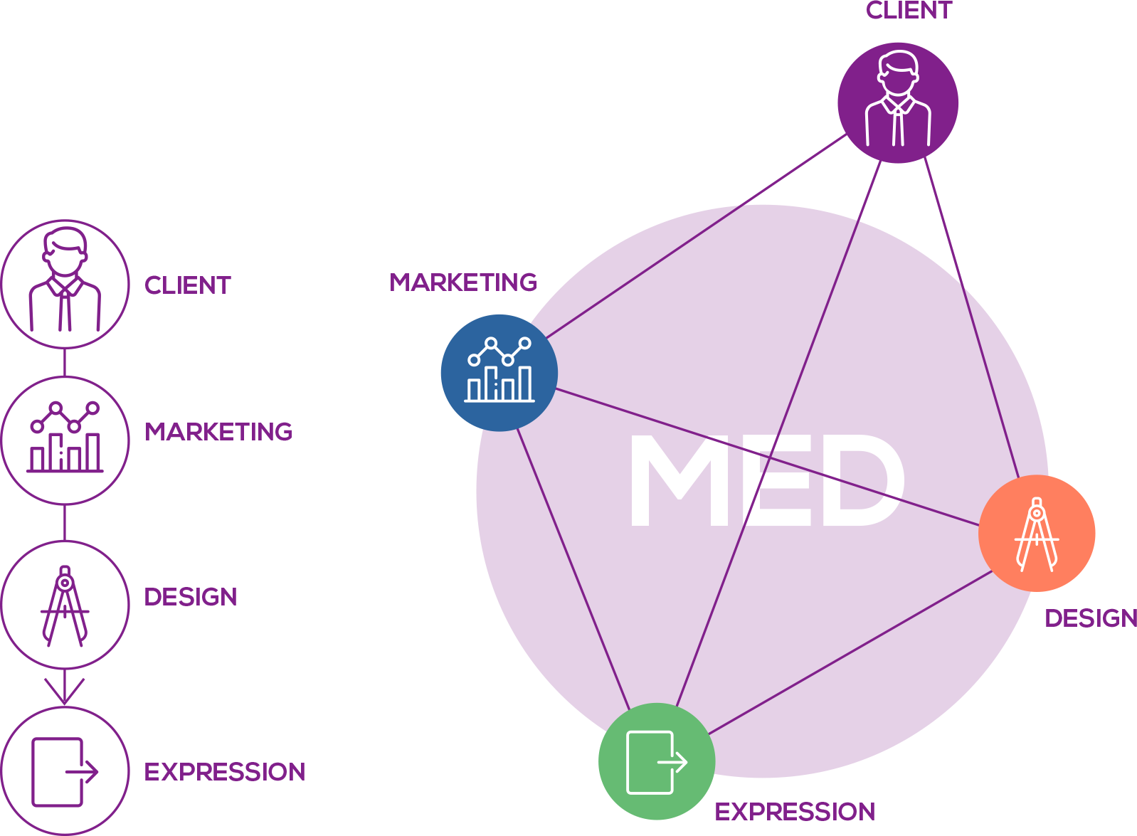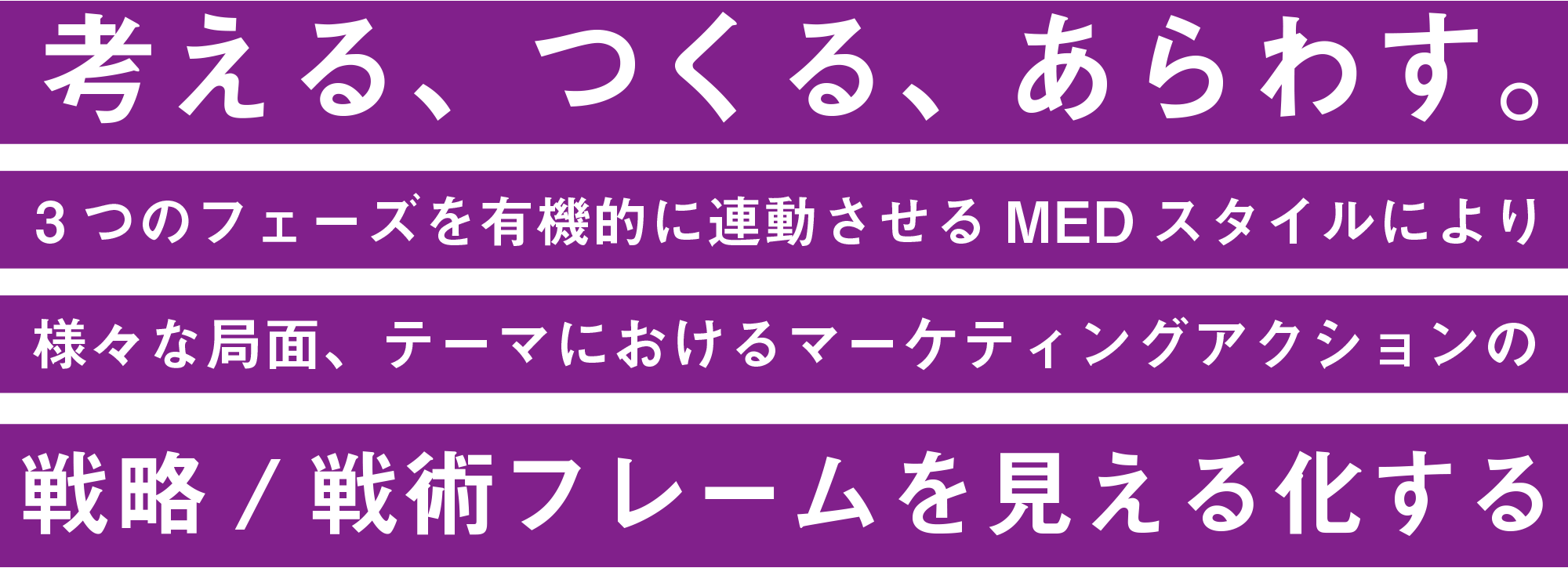 考えるだけでは、創るだけでは成功に到達しない。「考える・創る・表す」、3つの車輪でビジネスを、表現をドライブさせていくMED。MEDは、マーケティングを起点に、体験を促すデザイン、そして体験そのものを創るアウトプットをセットにし、「考える・創る・表す」を同時サポートする、新しいマーケティングアクションチームです。