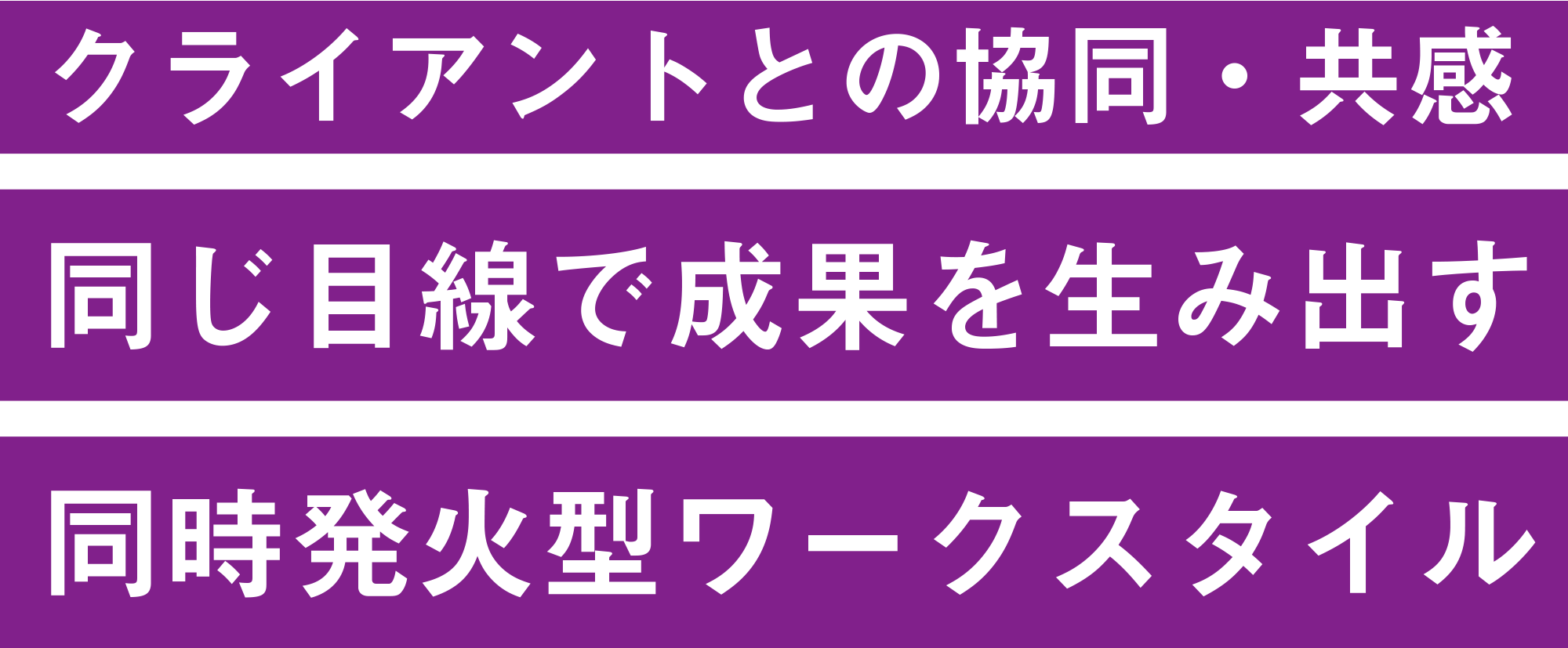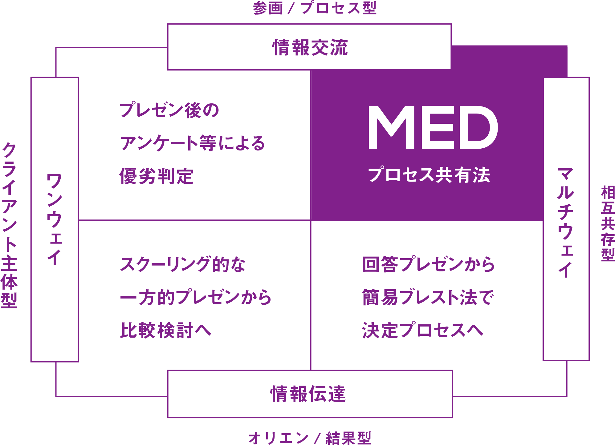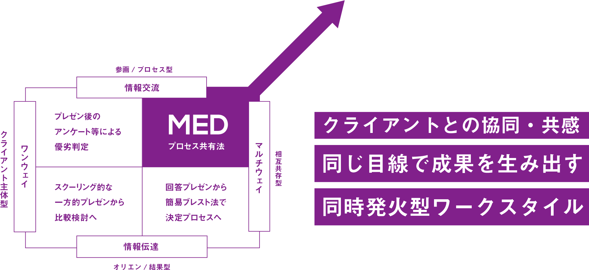 MEDは従来の「オリエンテーション→提案→検討・評価」という流れを見直します。クライアントとMEDは同じ目線を持ったゲマインシャフト的な関係を構築。アジャイルな進行の中で立体的につながり、成果を生み出していきます。