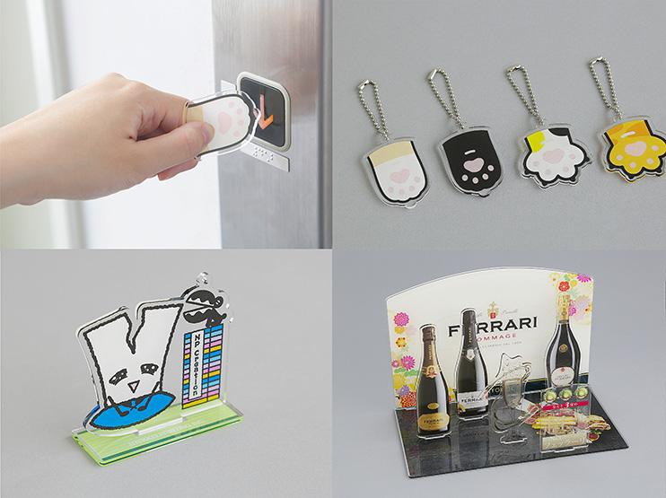 キーホルダーのような小物から、人気のアクリルスタンドなど、さまざまなサイズのアクリル素材アイテムに対応しています。