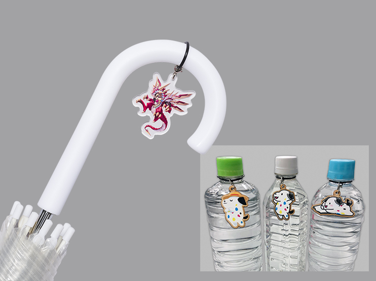 傘やペットボトルをデコレーションするアイテムとして人気です。アクリルチャームとしてグッズ展開もできます。