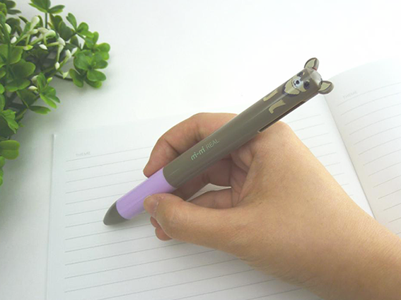 軸にプリントされたキャラクターに合わせ、ノック部分を耳や手など、さまざまなバリエーションに変えることができる2色ボールペンです。芯/インク 赤・黒 ※他の色の組合不可