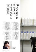 私たち製版部がこだわりを持って続けていることは、製品の品質向上と作業の標準化を実現すること。私たちが常に安定した品質を維持し、ご提供し続けることが、お客様の安心と満足につながるとの考えのもと、作業環境の改善に日々取り組んでいます。 その取り組みのひとつが、約600項目にわたる作業手順を、それぞれにまとめた「手順書」です。これは、現場での実務を通して得たノウハウの中から、最も適切で効率的な方法・手順をデータベース化したもので、約60名のオペレーターが共有。全員が作業のガイドラインとして活用することで、作業の標準化を図っています。 そのほかにも、想定できるあらゆるケースの判断基準をまとめた「判断基準表」、トラブル事例集、ハウスルールを整理した「イントラネット」の更新などによって、各スタッフの知識と技術を標準化し、品質の安定に努めています。 また、ものづくりの現場では、前後の作業工程と連携を図り、スムーズな流れをつくることも重要です。私たちは、ひとつの製品ごとに「作業カルテ」を作成。入稿データに関する細かい情報や更新の履歴を記録し、後工程のスタッフに引き継ぐことで、不良品の削減をめざしています。60人の部員が共有する600項目の「手順書」製版部 G2製版課主任松林 賢志9 日経印刷CSRアクティブレポート