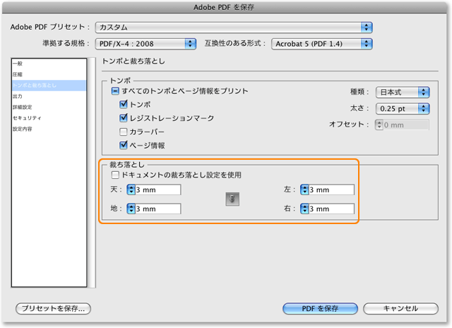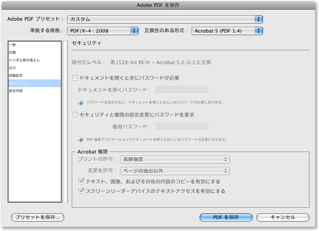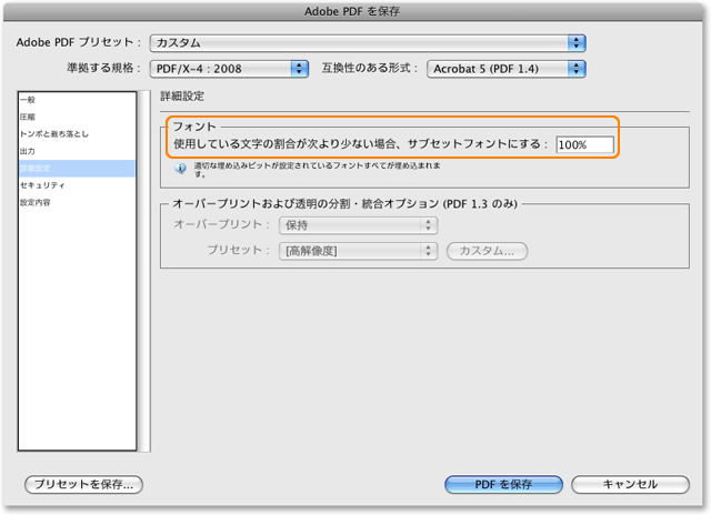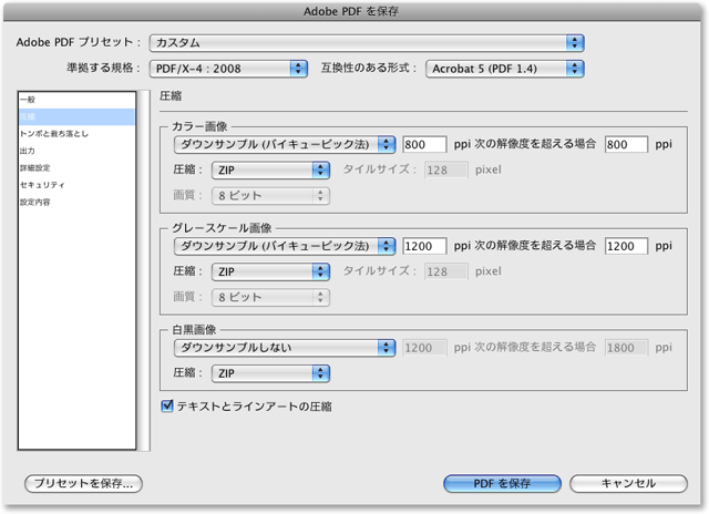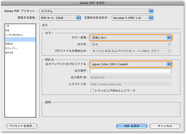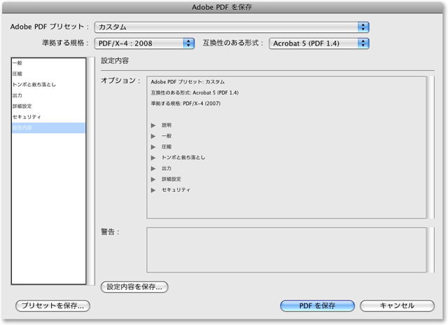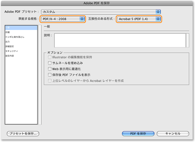 「準拠する規格:」を「PDF/X-4:2008」に、「互換性のある形式:」を「Acrobat 5 (PDF 1.4)」に設定してください。