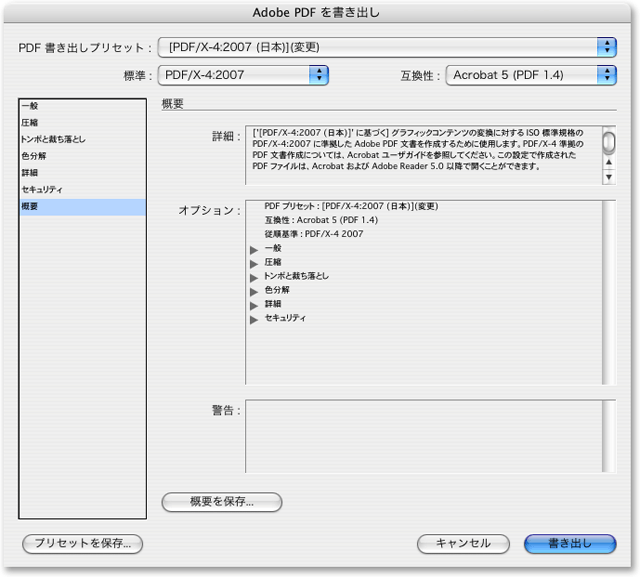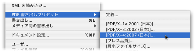 [ファイル]メニューから[PDF書き出しプリセット]→「PDF/X-4:2007(日本)」を選び、任意の名前と保存場所を指定してください。