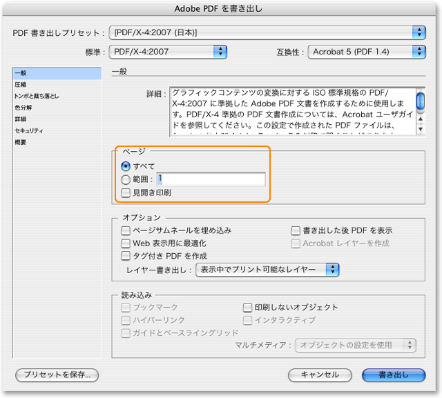 書き出すページを必要に応じて設定してください。また「見開き印刷」のチェックは必ず外してください。