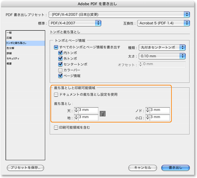「裁ち落とし」はすべて3mmとし、「ドキュメントの裁ち落とし設定を使用」のチェックは外してください。
