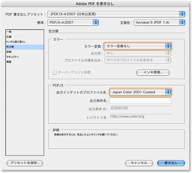 「カラー変換:」は「カラー変換なし」とし、「出力インテントのプロファイル名:」は「Japan Color 2001 Coated」としてください。