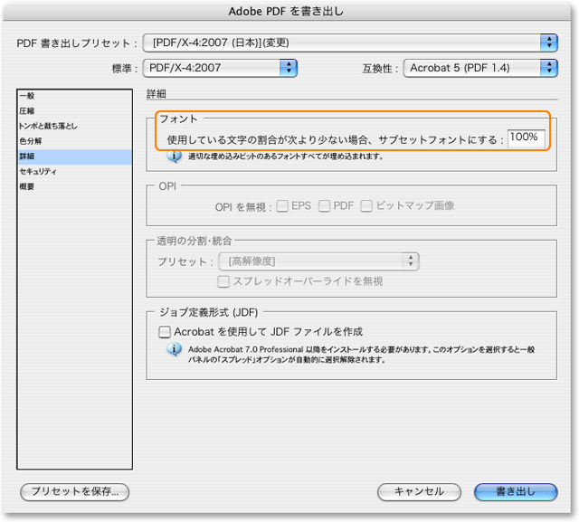 「使用している文字の割合が次より少ない場合、サブセットフォントにする:」は「100%」にしてください。