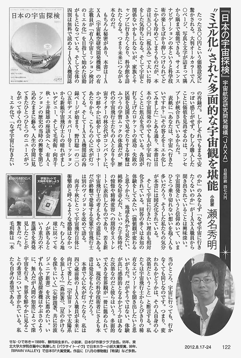 週間朝日8月17-24日合併号」にて、小説家の瀬名秀明さんが「日本の宇宙探検」をご紹介くださいました(2012.08.21)